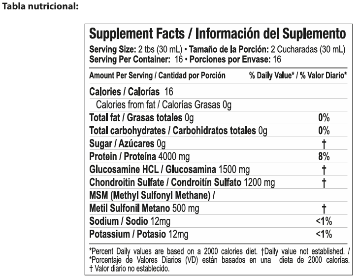 Alto valor nutricional en poco volumen. Combinación líquida de glucosamina, condroitina, MSM y colágeno hidrolizado.